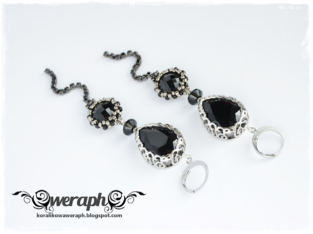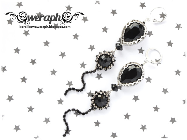 Czarne krople 18x13mm oprawiłam w carge, dodałam nietypowe, spłaszczone bicony oraz oplecione, bogato fasetowane kaboszony, oprawione tradycyjnie w koraliki. Użyłam koralików nickel i opaque jet 15/0, 11/0 i TT. Lekkości dodaje czarna taśma cyrkonowa.